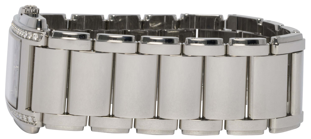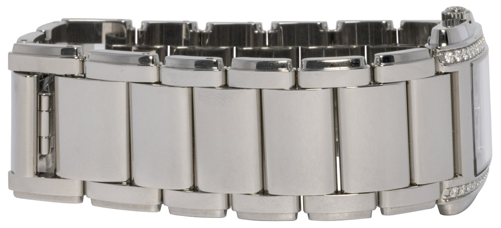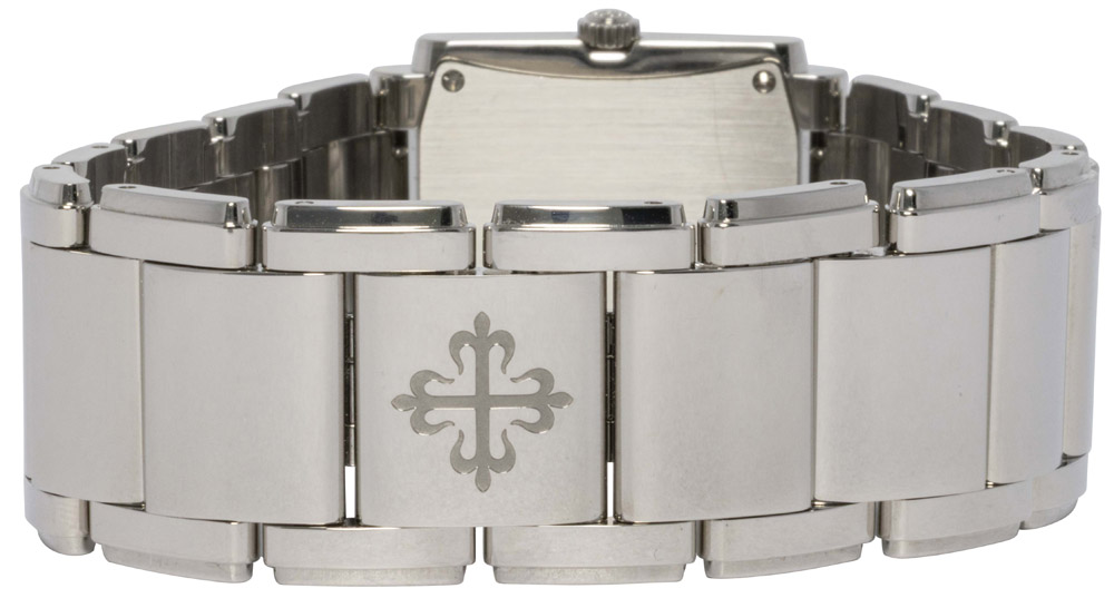 Patek Philippe Twenty~4 ref. 4910/1200A-001 er et fabriksnyt 2025-eksemplar af den ikoniske damekollektion, skabt til at forene tidløs elegance med moderne luksus. Kassen måler 25,1 x 30 mm og er udført i poleret stål med to rækker af diamanter, der giver et sofistikeret og eksklusivt udtryk.