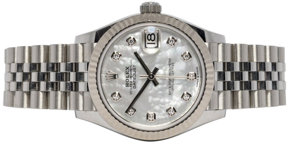 Skiven i perlemor (MOP) er helt unik i sit naturlige spil og fremstår ekstra eksklusiv med diamantindeks, som tilføjer et smukt og feminint udtryk. Datovisningen kl. 3 forstørres af den klassiske cyclops-linse for optimal læsbarhed.