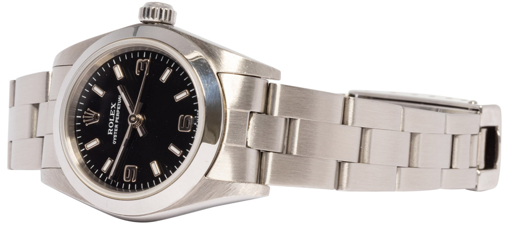 Rolex er kendte for deres klassiske og tidløse designs. Et af de mest klassiske er dette 26 mm Rolex Oyster Perpetual med sort urskive. Dette Oyster Perpetual, med reference 76080, har en smuk sort urskive med arabiske tal kl. 3, 6 og 9.
